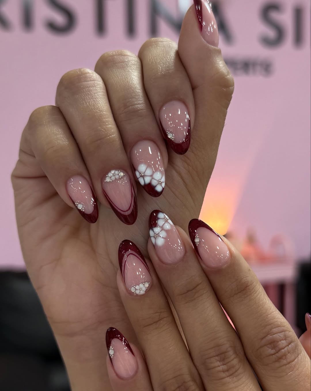 10PCS Handmade French Press-On Nails – 3D Floral Pink White, Medium Length