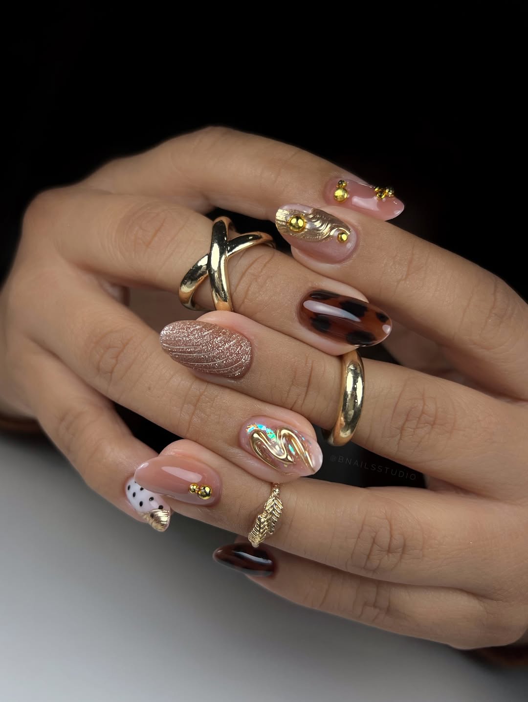 10PCS Gothic Gold Press-On Nails – Long Almond, 3D Floral & Pearl