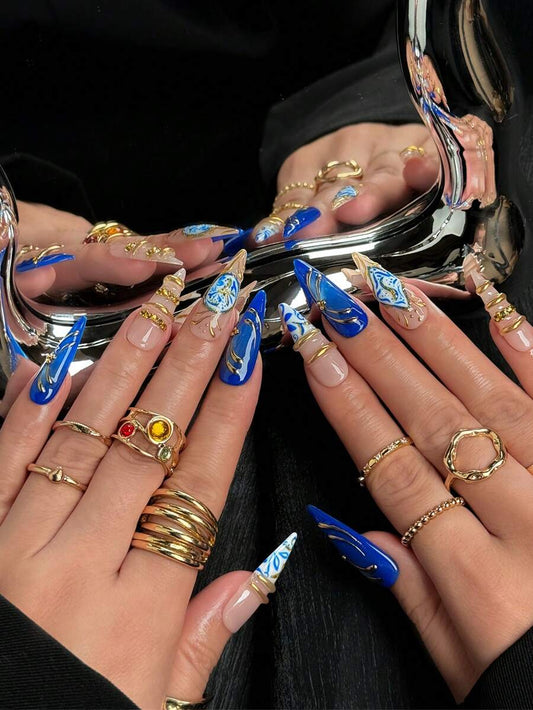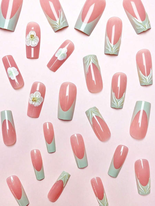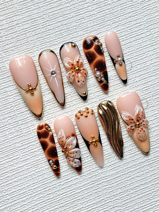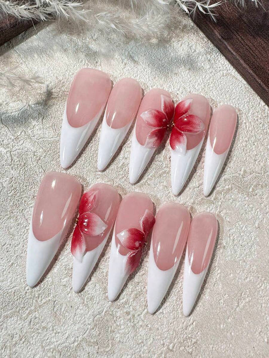 Handmade 3D Floral French Press-On Nails – Pointed Shape