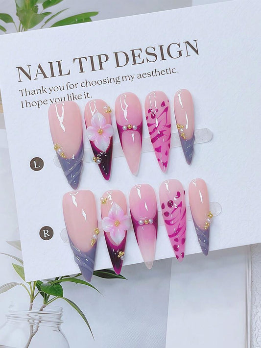10PCS Y2K 3D Floral Press-On Nails – Almond Shape, Pink Purple